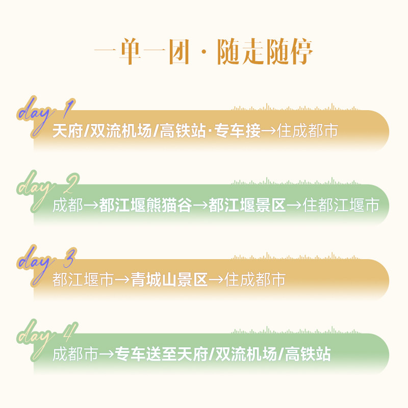 本产品精心规划4天3晚行程,时间紧凑却不仓促,完美适配差旅人士有限的假期窗口。从抵达成都到游览熊猫谷、都江堰、青城山,再到返程,全程节奏合理,既能高效完成观光目标,又不会因行程过长影响后续工作安排,是商务出行后理想的小长假补充。