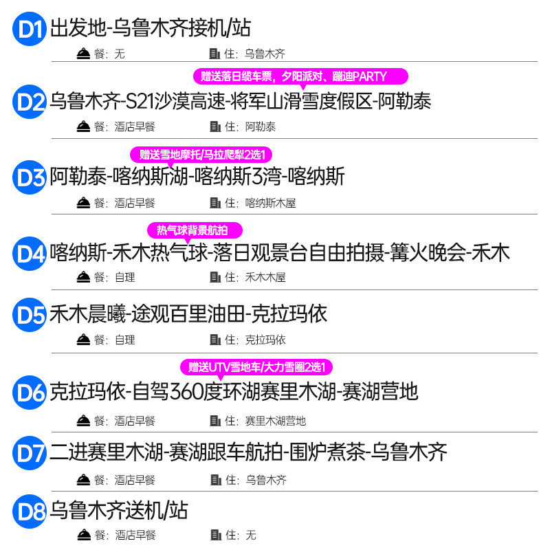 行程以乌鲁木齐为起点和终点,便于搭乘全国乃至国际航班抵达,特别适合从内地或海外赴新疆出差的商务旅客。结束工作会议后可直接开启8天7晚的北疆之旅,无需额外中转奔波。乌鲁木齐作为交通枢纽,酒店、餐饮及配套服务完善,让差旅与度假切换自如,节省宝贵时间成本。