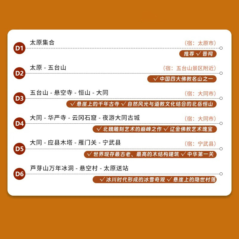 本线路以太原为唯一集合与解散地,极大方便从太原本地或经高铁、航班抵达太原的差旅人士。行程覆盖大同、忻州、朔州等山西北部核心城市,交通衔接顺畅,无需额外中转奔波。对于商务出差后想顺道深度游的旅客而言,可高效利用周末或调休时间开启6日文化之旅,真正实现‘工作+度假’无缝切换,节省时间成本,提升出行效率。