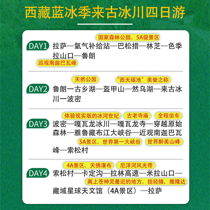 本行程专为差旅人士设计,从拉萨便捷出发,无缝衔接林芝核心景点,涵盖来古冰川、南迦巴瓦峰日照金山及鲁朗小镇等世界级自然奇观。四日行程节奏合理,既满足高效出行需求,又融入深度度假体验。特别适合在西藏出差后顺道放松身心的商务旅客,无需额外安排行程,即可享受高原蓝冰季的独特魅力,实现工作与旅行的完美平衡。