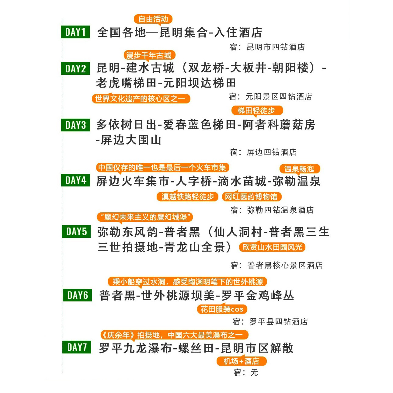 行程以昆明为起点和终点,高效串联红河、曲靖、文山等滇东南精华区域,涵盖元阳梯田、罗平油菜花、坝美世外桃源、滴水苗城、东风韵等标志性景点。对于从昆明出差或中转的旅客而言,无需额外奔波,即可在7日内深度体验云南多元地貌与民族文化,将差旅间隙转化为高性价比的沉浸式度假体验。