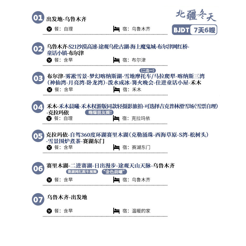 本行程支持1人单独预订,极大提升了商务差旅或独自出行者的灵活性。无需等待拼团,随时可根据工作安排调整出发时间,特别适合临时调休或周末短假的职场人士。从乌鲁木齐出发,深入阿勒泰、博尔塔拉等地,畅游喀纳斯、禾木与赛里木湖,即使独自一人也能沉浸于冰雪王国的静谧与壮美之中,兼顾高效差旅与深度度假体验。