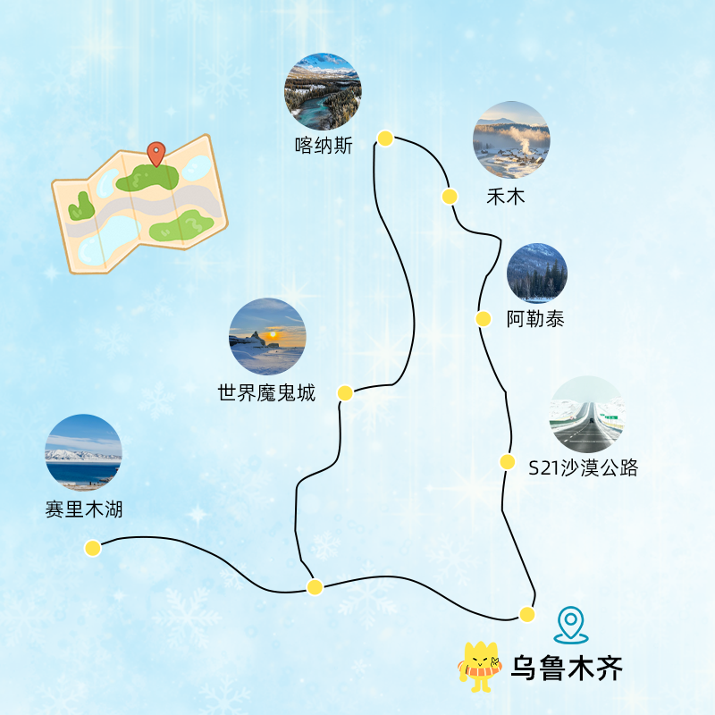 从乌鲁木齐出发,经阿勒泰(喀纳斯、禾木、吉克普林)、博尔塔拉(赛里木湖)再返回,科学规划动线,避免重复折返。对于需在多地开展业务的差旅者,此线路可同步完成多地拜访与度假需求,最大化利用出行时间,一趟旅程覆盖北疆自然与人文精华。