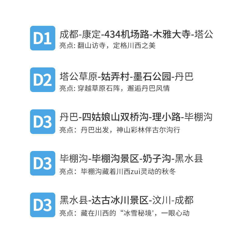 从成都市区直接出发,行程设计充分考虑商务旅客的时间效率。结束会议或工作后,当天即可启程前往甘孜、阿坝,无需额外中转或住宿等待。5天紧凑而充实的行程覆盖达古冰川、四姑娘山、毕棚沟、塔公草原等核心景点,让差旅人士在有限时间内高效完成从城市到雪域高原的切换,实现工作与自然疗愈的完美平衡。