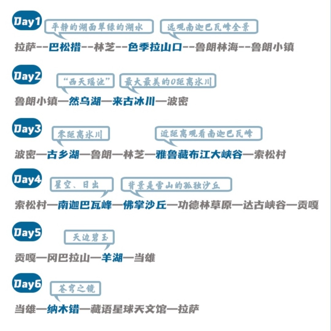 仅用6天时间,即可高效游览西藏最具代表性的自然奇观——羊湖的湛蓝、纳木措的圣洁、南迦巴瓦的雄伟与来古冰川的原始。行程从拉萨始发并返回,便于衔接航班或铁路,极大节省差旅时间成本。每日安排科学,既保障高原适应,又确保关键景点全覆盖,是时间紧张但追求深度体验的差旅者首选。