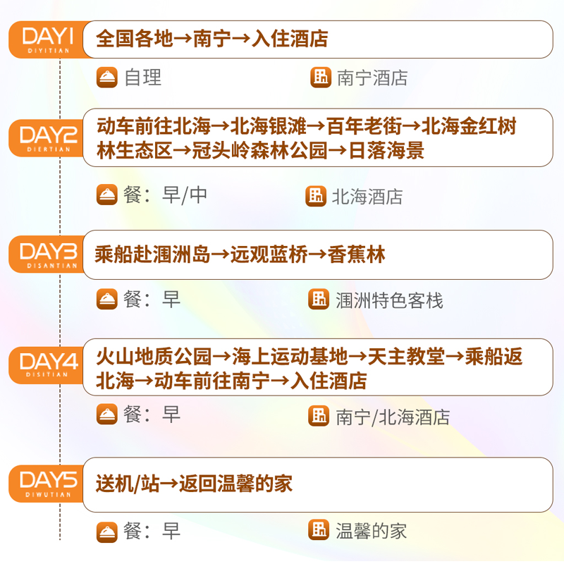 5天4晚的行程设计精准匹配现代差旅人士的休假习惯——利用年假+周末组合,或项目间隙的短暂空档即可完成一次完整海岛之旅。行程节奏张弛有度,既有涠洲岛环岛探索,也有北海市区文化体验,确保在有限时间内收获最大满足感。