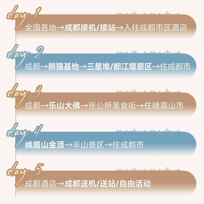 全程精选四钻标准酒店,位置优越、设施完善,确保您在每日行程结束后获得高质量休息。无论是成都春熙路商圈,还是峨眉山脚静谧居所,均兼顾便利性与舒适度,助力差旅人士快速恢复状态,以饱满精神应对工作与探索双重挑战。