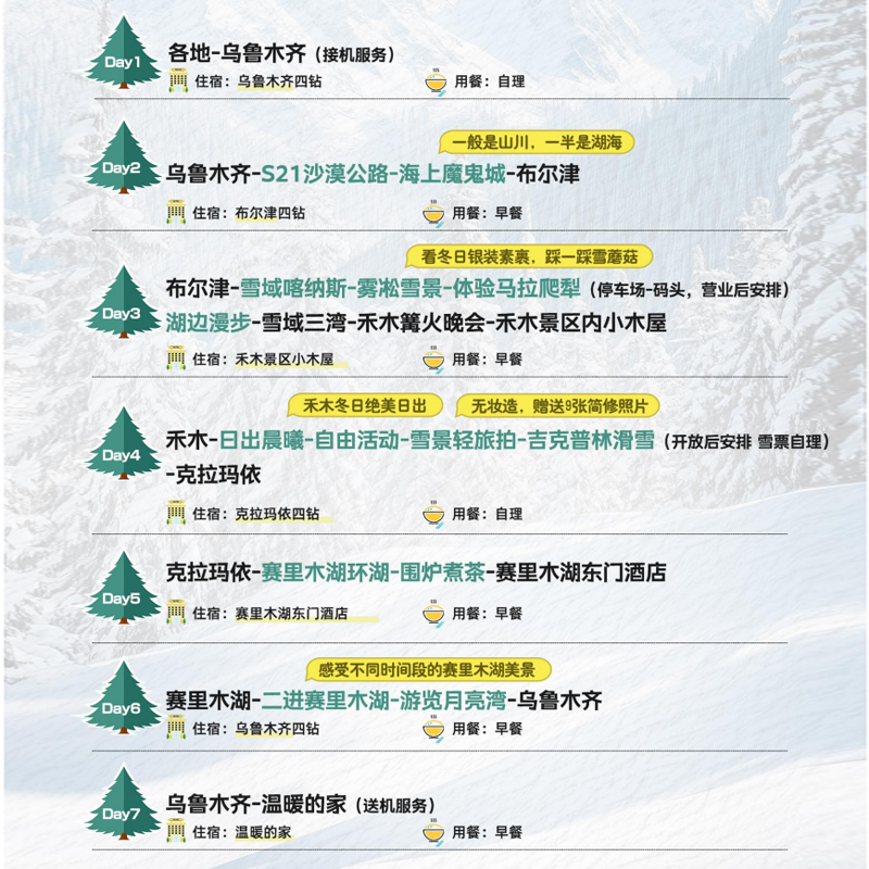 针对来自上海、北京、广州等28个主要城市的商务人士,本产品支持“1人可订”,彻底解决差旅中因同行人数不足而无法成团的难题。无论您是临时出差后想顺道放松,还是独自完成项目后犒赏自己,都能即刻启程前往新疆阿勒泰、博尔塔拉,畅游赛里木湖、喀纳斯与禾木,享受7天6晚的纯玩假期,无需等待拼团,行程自由度高,完美融合高效差旅与深度度假体验。