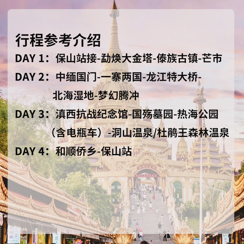 线路设计形成德宏—瑞丽—腾冲—保山的顺向闭环动线,避免走回头路,最大化节省差旅时间成本。从芒市站接站始,至保山站送团终,全程交通衔接流畅,特别适合在滇西多地有公务安排的人士,顺路完成一场高性价比度假。