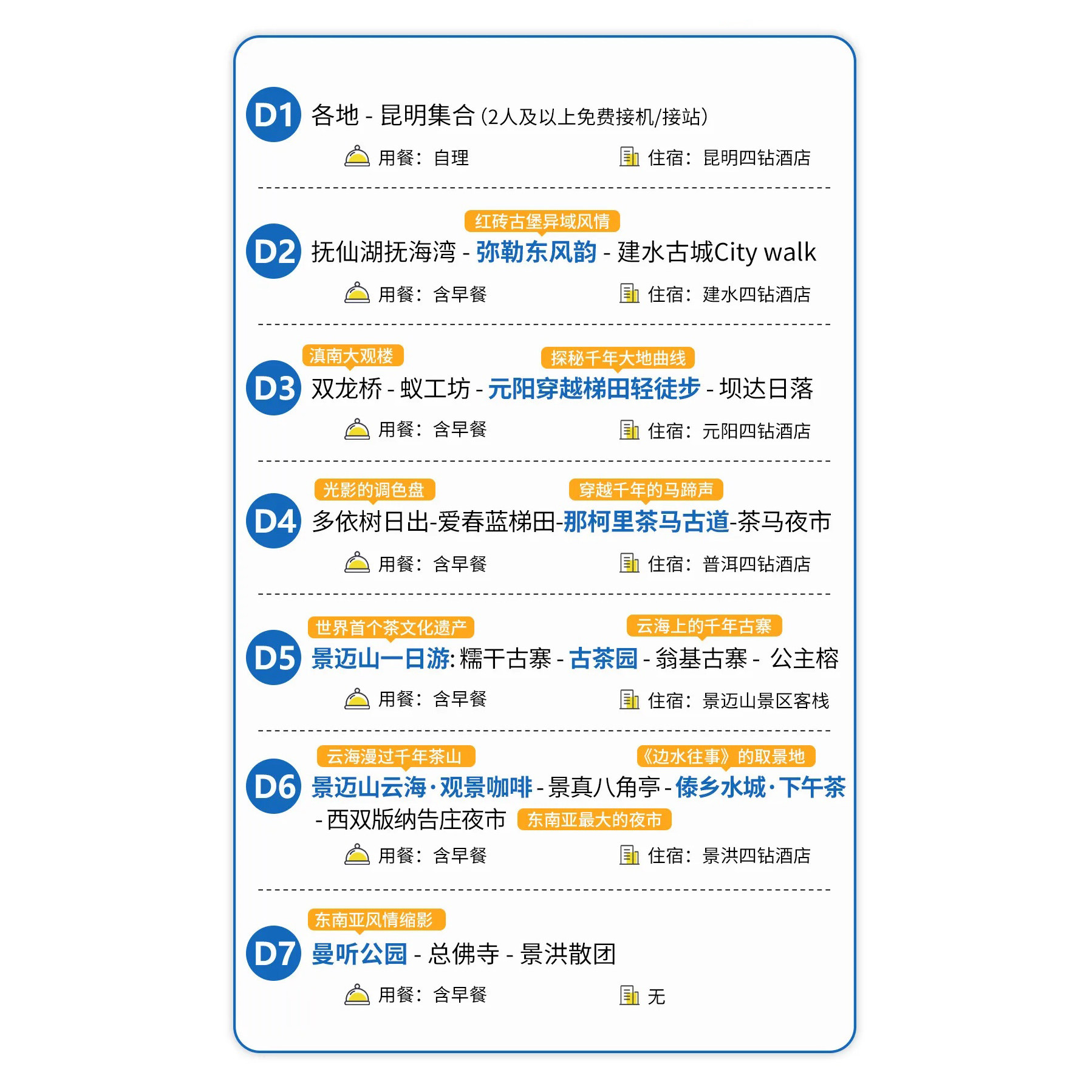 行程精心规划昆明出发,高效串联红河(元阳梯田、建水古城)、普洱(那柯里茶马古道)、西双版纳等滇南核心区域,7日内覆盖自然奇观、民族文化和热带风情。对差旅人士而言,这意味着在有限假期中最大化体验多样性——既能领略世界级梯田景观,又能深入茶山秘境与傣族水乡,实现一次出行多重收获。