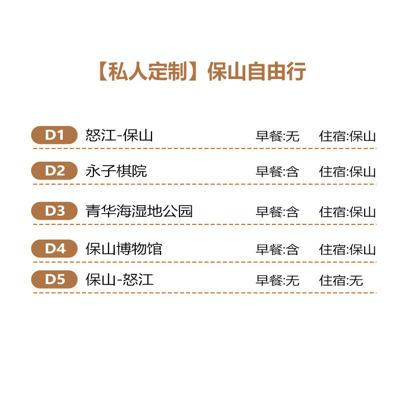专为商务与休闲兼顾的差旅人士打造,本线路支持1人单独预订,无需拼团等待,极大提升出行自由度。从怒江出发前往保山,5日行程节奏合理,既满足高效差旅需求,又融入深度度假体验。无论是临时出差后的短途放松,还是结合会议安排的周边游,都能轻松实现无缝衔接,让您的差旅不再单调。