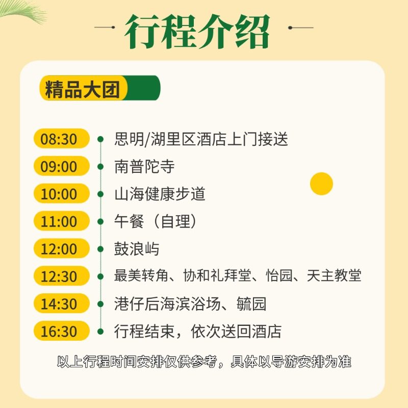 针对商务差旅人士时间紧张的特点,本行程提供厦门岛内(思明区/湖里区)酒店免费接送服务,无需自行打车或导航前往码头。工作人员将在出发前一晚21:00前通过短信或电话告知具体上车时间与地点,确保您从容安排行程。散拼模式虽可能因接站顺序略有等待,但整体高效衔接,最大化利用有限的差旅间隙,实现工作与休闲的无缝切换。