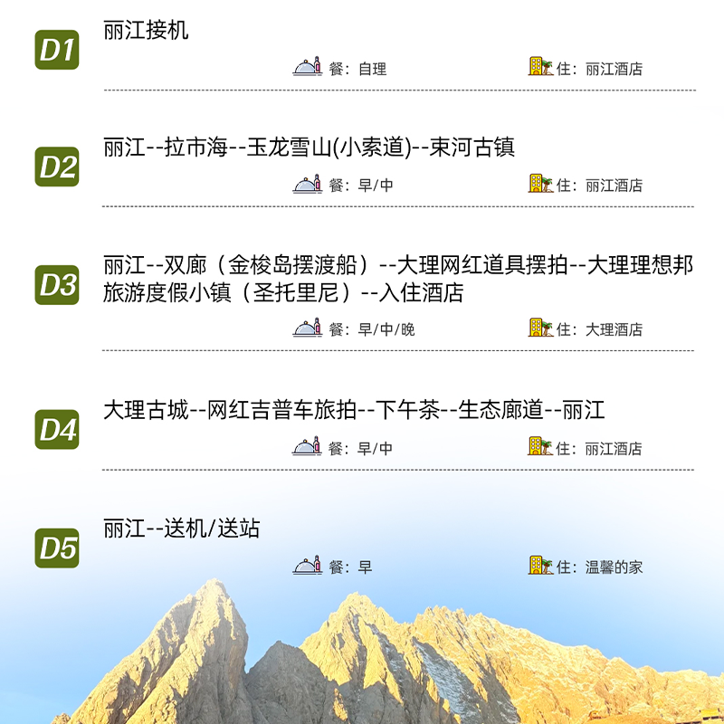 5天4晚的行程设计精准匹配多数企业年假或周末+调休的组合,尤其适合利用出差间隙或短假期出行。行程紧凑而不仓促,既能深度游览丽江古城、玉龙雪山,又能前往大理环洱海,高效覆盖滇西两大核心目的地,实现差旅与度假的无缝融合。