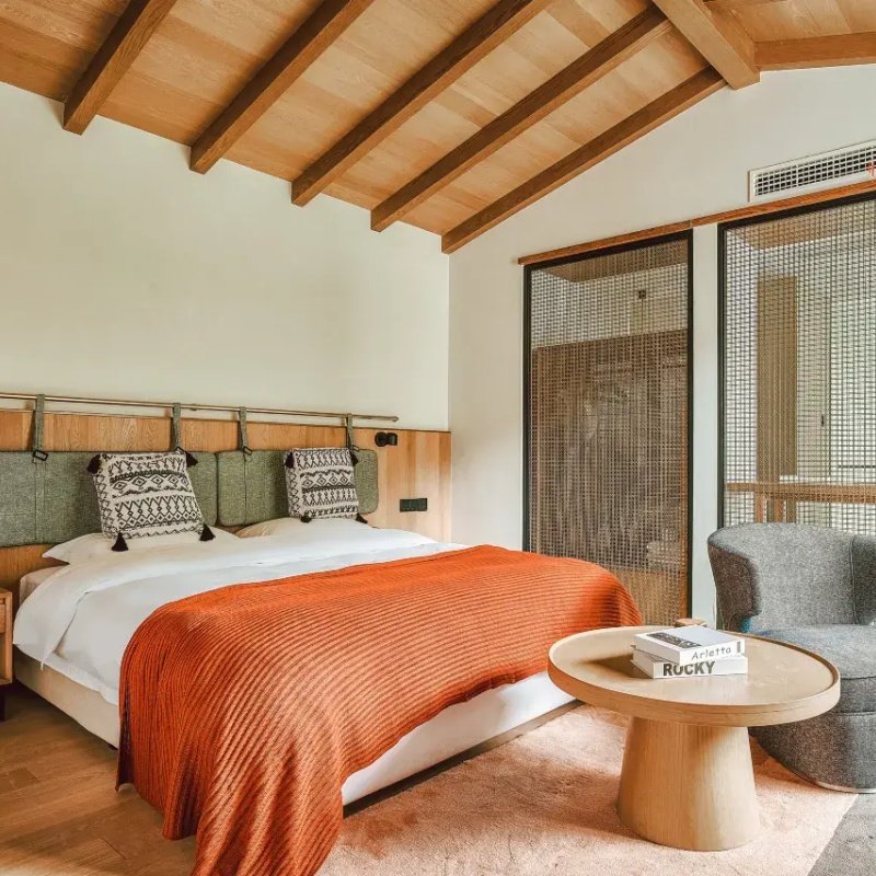 坐落于60亩竹海湖泊间的奢野秘境,民宿以全景落地窗将山野盛景引入室内,让差旅人士在繁忙会议或奔波之后,足不出户即可享受视觉与心灵的双重放松。远离城市喧嚣,呼吸清新空气,这种‘办公+疗愈’一体化的住宿体验,极大提升差旅幸福感,让短暂停留也能成为深度休憩。