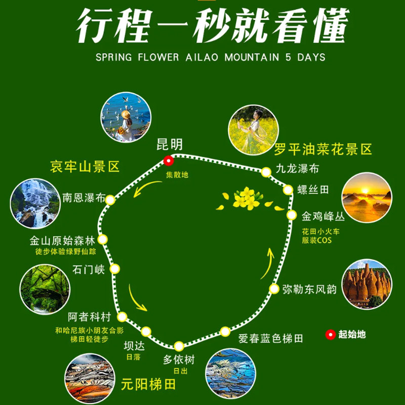 5天时间高效串联元阳梯田、阿者科、弥勒、罗平油菜花海与九龙瀑布等滇东南核心景观,特别适合利用周末加年假完成一次高质量短途度假。行程节奏张弛有度,既满足差旅人群对时间效率的要求,又确保深度体验自然与人文之美,让短暂假期也能收获满满回忆。