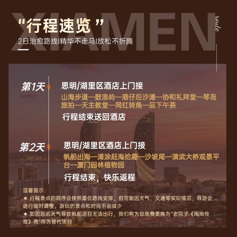 2天1晚的行程长度精准匹配差旅间隙——可利用周五下午至周日返程,或周三周四调休组合。高频次、短周期的设计,让忙碌的职场人无需请长假即可享受完整度假体验。鼓浪屿的慢生活与帆船出海的动感交替,恰到好处地调节工作与生活的节奏。