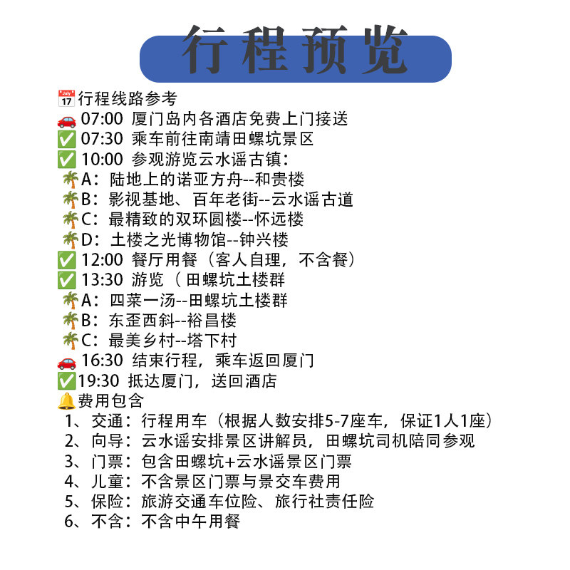 告别琐碎安排!本产品包含南靖云水谣与田螺坑双景区门票、厦门酒店往返接送、专业中文导游、特色土楼午餐,全程无购物、纯玩无干扰。差旅人士只需专注核心工作,其余交给我们——省时、省力、省心,最大化利用有限的休假时间。