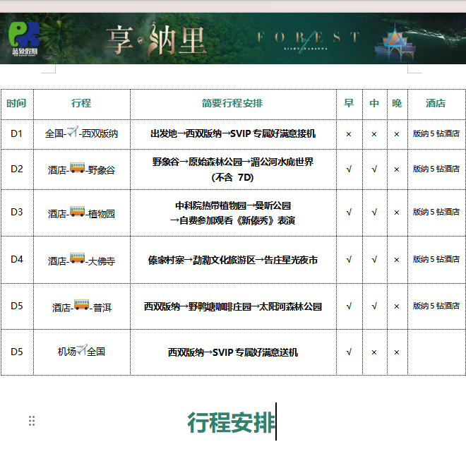 行程精心规划为6天5晚,既避免过长影响返岗安排,又确保充分沉浸于西双版纳的自然与文化魅力。您可在野象谷追踪亚洲象踪迹,在星光夜市品味傣味小吃,还能探访普洱茶山,感受慢生活节奏。这一时长特别适合利用年假+周末组合,或在差旅任务完成后直接开启疗愈之旅,实现工作与生活的高效平衡。