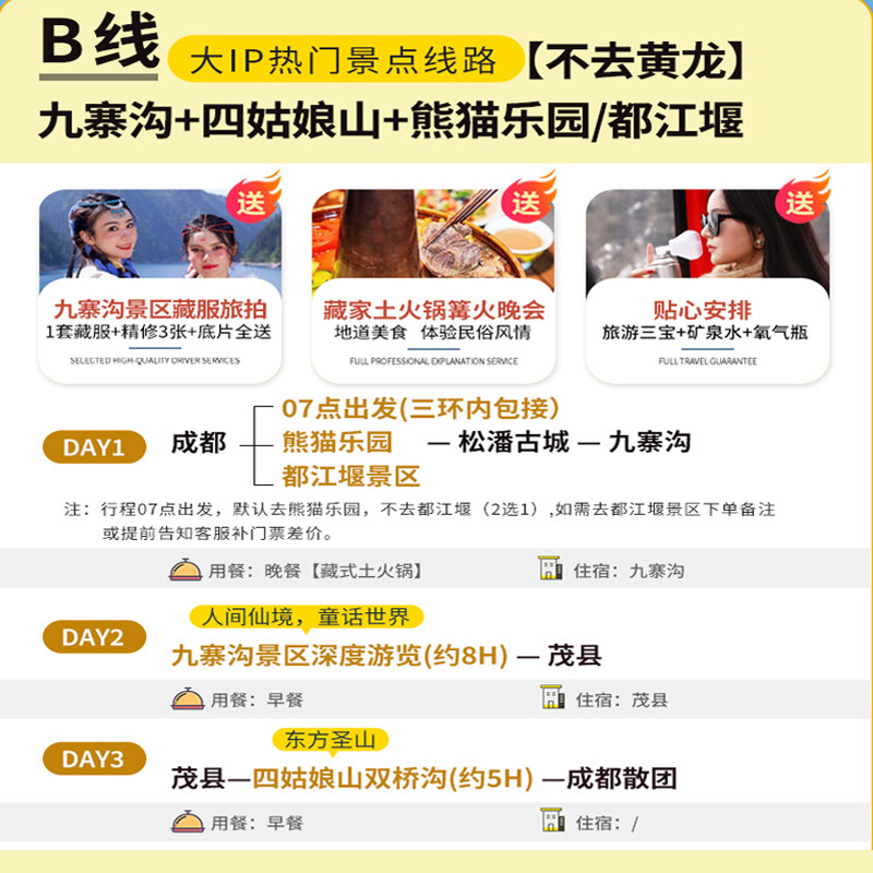 深知差旅时间宝贵,本产品坚持纯玩无购物原则,杜绝隐形消费与无效停留。所有景点、体验、餐饮均提前规划,确保每一分钟都用在刀刃上。专业导游全程陪同,高效讲解不拖沓,让您在3天2晚内最大化收获川西精华,真正实现‘出差+度假’无缝切换。