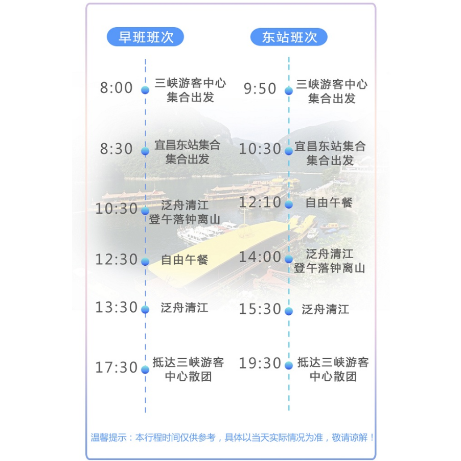 专为时间紧张的差旅人士打造,行程安排科学合理,清晨出发,傍晚返回,确保不影响次日工作安排。乘坐舒适游轮沿清江缓缓前行,欣赏两岸如诗如画的峡谷风光,途中提供简餐与休息区,兼顾舒适性与效率。全程无需换乘,一站式服务让差旅度假更轻松。