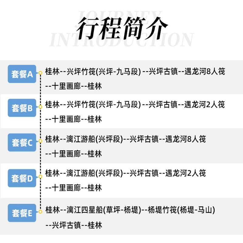 本产品整合“游船+竹筏+古镇”三大核心元素,打造主题鲜明的桂林山水文化一日体验。差旅人士无需自行规划路线,即可高效打卡漓江精华段、遇龙河生态区及兴坪人文古镇,全面感知“桂林山水甲天下”的内涵。这种结构化设计让短暂假期也能收获完整而深刻的地域文化印象,提升差旅附加值。