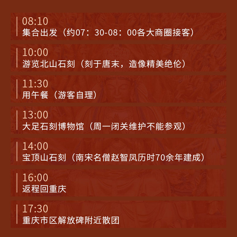 区别于常规观光,本产品以‘佛教密宗石窟’与‘盛唐石刻’为主题,打造深度文化主题游。即使只是短暂停留重庆,也能获得结构清晰、内容丰富的文化体验。对频繁出差的职场人士而言,这样的主题化行程能有效打破差旅重复感,增添旅途新鲜感与意义感。