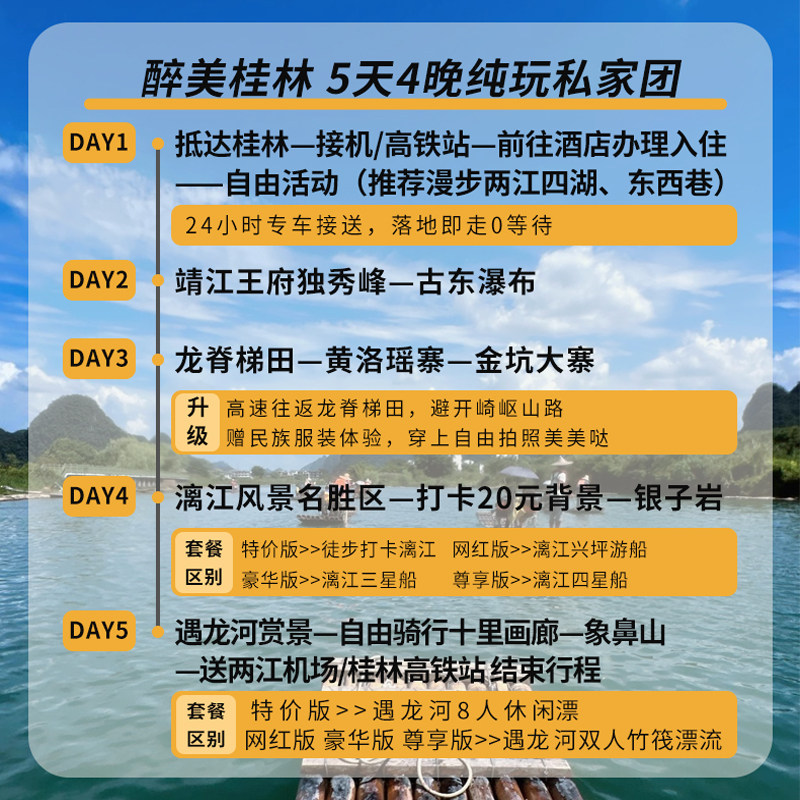 本行程支持1人独立预订,无需拼团等待,特别适合临时出差后顺道放松的商务人士。桂林作为山水甲天下的目的地,不仅风景如画,交通与接待设施也高度成熟,无论是独自出差后的短暂停留,还是结合会议安排的休闲延伸,都能无缝衔接。行程采用私家团模式,专属用车与导游服务保障隐私与效率,让差旅中的片刻闲暇转化为身心充电的优质体验。