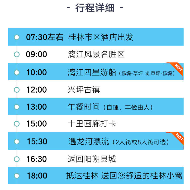 行程起点与终点均设在桂林市区,无需跨城奔波,极大便利差旅人士的交通接驳。无论是高铁抵达桂林站,还是从两江机场转乘,都能便捷参与。一日游结束后可直接返回酒店或前往车站,避免额外住宿与转运成本,真正实现‘落地即玩、玩完即走’的高效差旅度假模式。