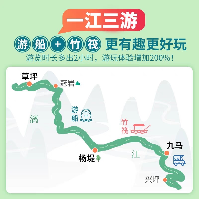 深知差旅人士时间宝贵,本产品承诺全程纯玩无购物店停留,杜绝隐形消费与推销干扰。所有景点门票、竹筏费用、演出票务均一价全含,导游仅提供文化讲解与行程协助。您可完全专注于山水审美与身心放松,无需应对额外推销压力,确保宝贵的休假时间100%用于真正有价值的体验,回归差旅度假的本质初心。
