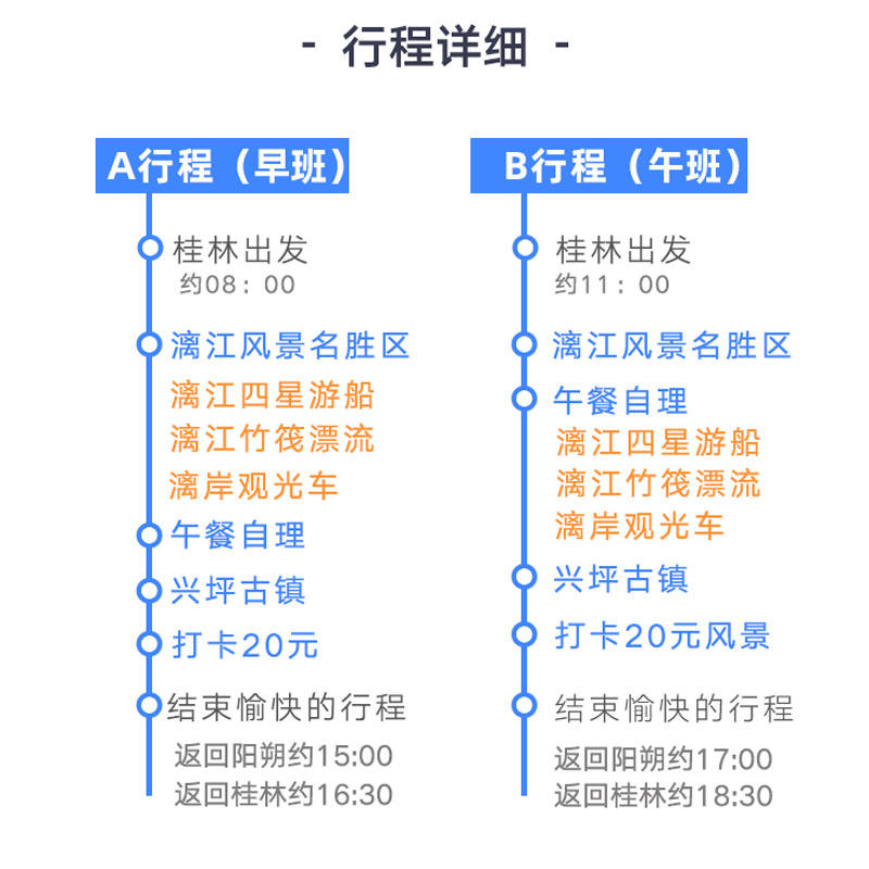 本产品主打“一江三游”概念——四星游船、竹筏漂流与冲坝体验三位一体,覆盖漓江精华段不同视角。差旅人士可根据时间灵活选择:清晨乘游船观九马画山,午后竹筏慢漂兴坪段,傍晚尝试刺激的冲坝激流。三种方式互补,既保障舒适度又增添趣味性,让有限的差旅假期收获多层次的漓江记忆,高效而不失深度。