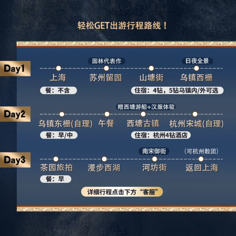 精心规划3天2晚行程,涵盖杭州西湖夜游、乌镇西塘双古镇,兼顾自然风光与人文底蕴。对于仅有周末或短假期的差旅人士,此路线避免冗余交通,确保每一段旅程都有高价值体验。白天游览、夜晚休憩节奏分明,既满足观光需求,又保留充足休息时间以应对后续工作。