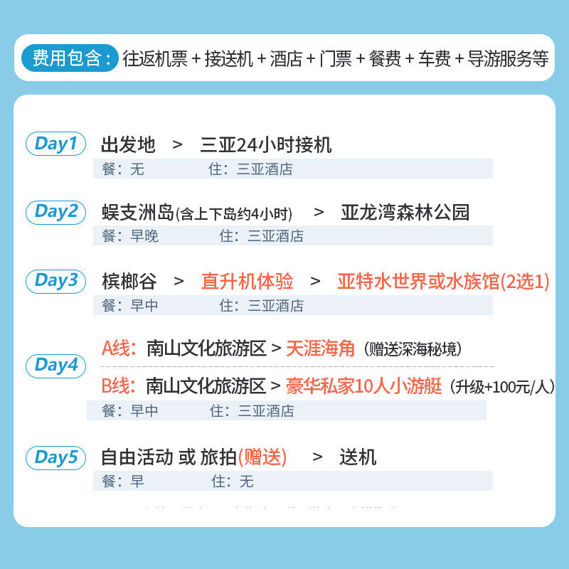 本产品覆盖杭州、上海、北京、广州、深圳等24个主要出发城市,提供含往返机票的5天4晚三亚纯玩小团行程。对于频繁出差的商务人士而言,可灵活利用周末或短假期,从工作地直接飞往三亚,省去中转烦恼。全程无购物、无隐形消费,确保您在高效完成差旅任务后,无缝切换至高品质海滨度假模式,真正实现‘工作度假两不误’。