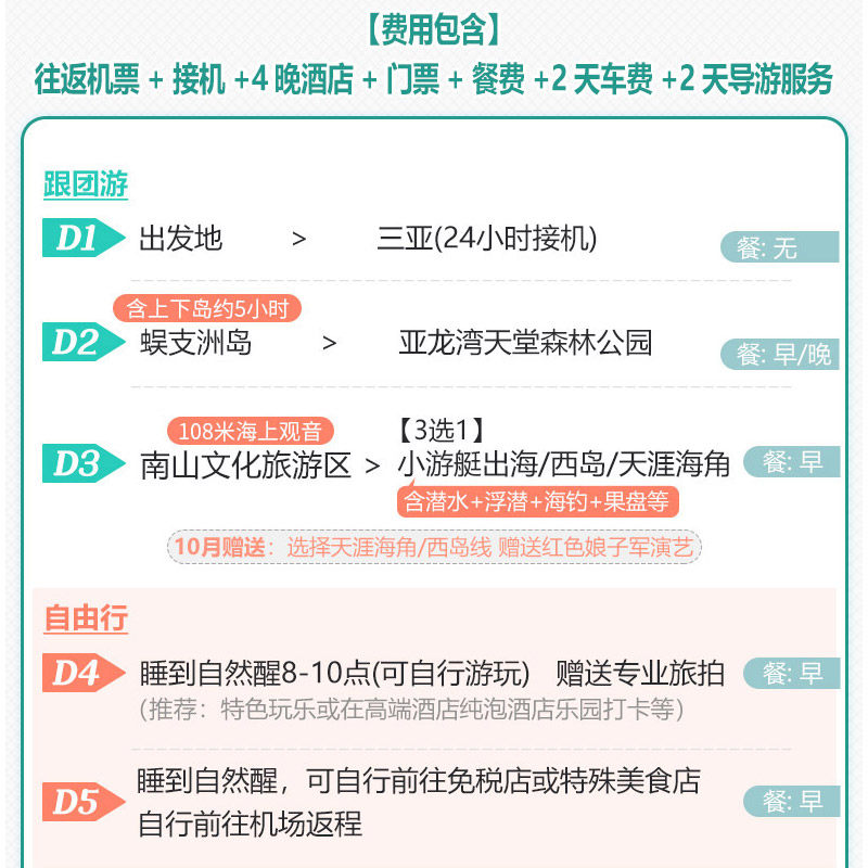 针对频繁出差的商务人士或独自出行的职场精英,本行程支持1人单独预订,无需凑团或等待他人同行。这意味着您可根据自身差旅日程自由安排出发时间,在完成工作任务后立即开启5天4晚的三亚疗愈之旅,享受专属假期,无需协调他人时间,真正实现差旅与度假的个性化结合。
