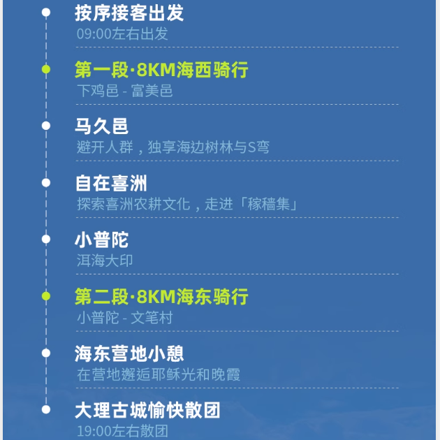 专为时间紧张的差旅人群打造,本产品采用一日闭环行程设计,清晨出发、傍晚返回,不占用额外住宿时间,完美嵌入您的商务日程。骑行路线经过精心规划,覆盖洱海精华段与网红打卡点,在有限时间内最大化体验感,让差旅之余也能深度感受大理的自然与人文魅力,实现工作与休闲的高效平衡。