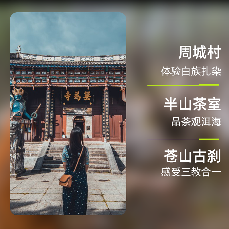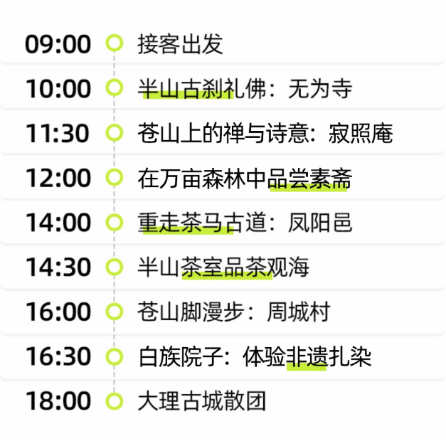 一日行程巧妙融合苍山自然奇观、白族非遗手作、古寺禅修、地道素斋四大核心体验,避免奔波于多个分散景点。这种高度集成的设计专为时间稀缺的差旅人士打造,用最短时间获取最丰富的文化与感官体验,实现‘高效度假’与‘深度旅行’的双重目标,让短暂假期价值最大化。