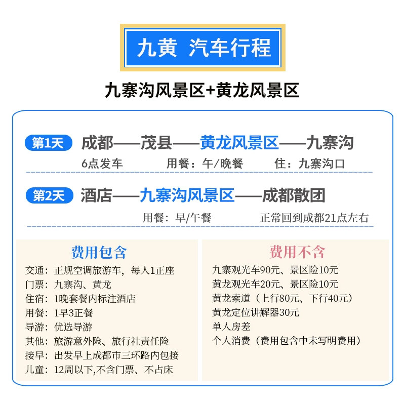 本线路专为差旅人士设计,从成都便捷出发,结合高铁与舒适旅游巴士,实现高效转乘。全程仅需2天时间,特别适合周末或小长假出行的商务旅客,在紧凑行程中轻松抵达世界级自然遗产九寨沟与黄龙景区,兼顾效率与深度体验,是高效差旅度假的理想选择。