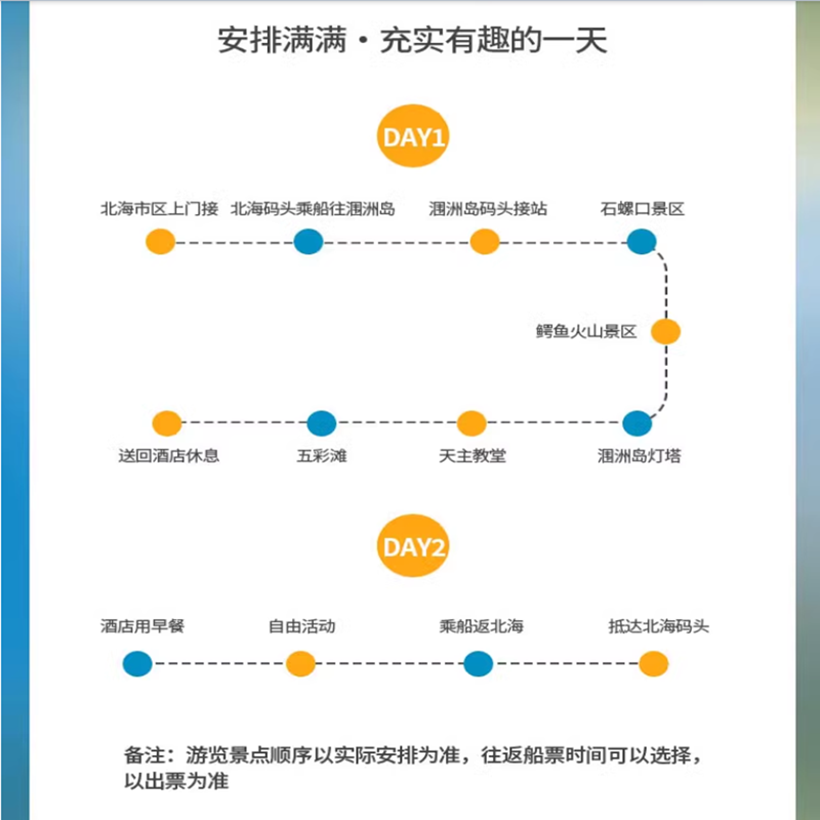专为差旅人士设计的便捷服务,行程包含北海市区上门接站,无需自行辗转交通,节省宝贵时间。无论是商务出差后的小憩,还是临时起意的短途放松,都能无缝衔接,让您的2天1晚涠洲岛之旅从出发那一刻起就轻松无忧。特别适合时间紧凑、追求效率的职场人士,在繁忙工作之余快速切换至度假模式。