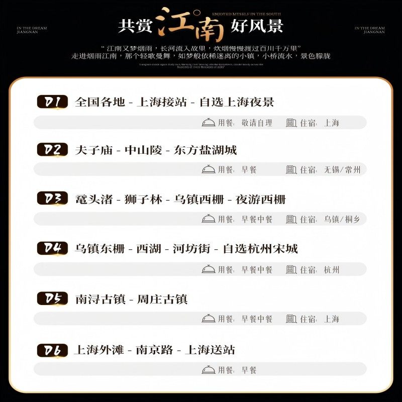 本行程特别支持单人预订,无需拼团或等待他人同行,极大提升了差旅人士的出行自由度与效率。无论您是临时出差后想顺道放松,还是独自前往长三角考察市场,都能即订即走。结合上海出发、覆盖南京、苏州、杭州等核心城市的6日行程,既满足商务洽谈需求,又融入乌镇夜游、周庄水乡等休闲元素,实现工作与度假的无缝衔接。