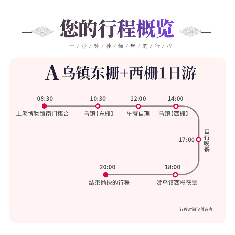产品同时支持从上海与杭州两大经济中心城市出发,精准覆盖长三角高频差旅人群。无论您是在陆家嘴开会还是在西湖边洽谈,均可便捷接入乌镇一日游线路。地理邻近性大幅降低交通成本与时间损耗,让周边度假真正成为差旅生活的自然延伸。