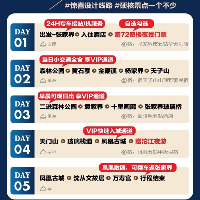 行程覆盖张家界市区、森林公园、天门山及湘西凤凰,所有目的地均位于湖南省内,车程合理,交通接驳顺畅。对于从外地赴湘出差的旅客,可直接将此线路嵌入差旅日程末端,无需额外中转,实现公务与度假的高效衔接。