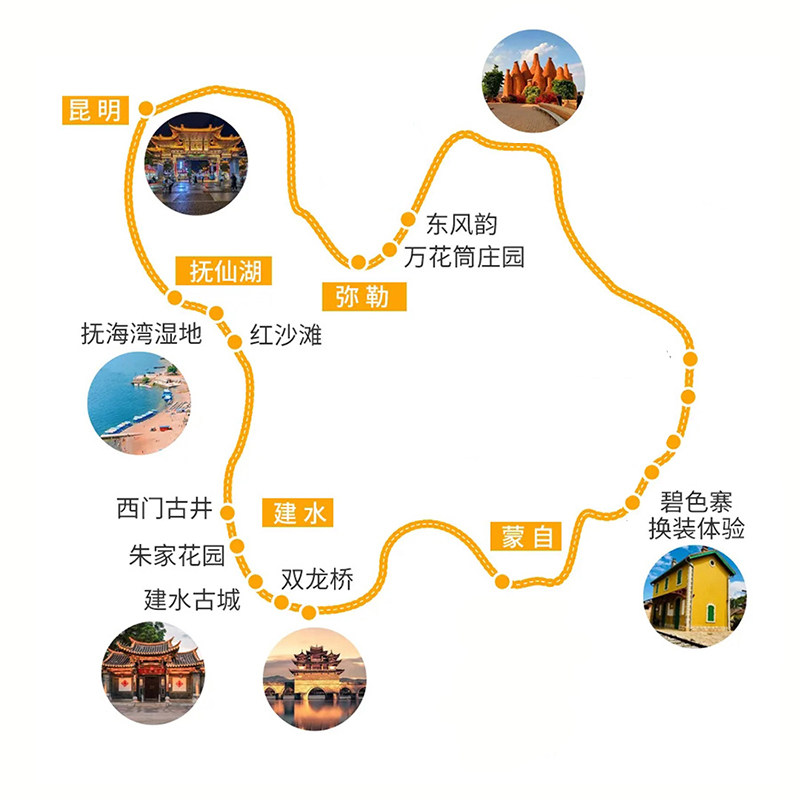 本线路以昆明为起点,高效串联红河州(建水、蒙自)与玉溪市(抚仙湖、弥勒),避免重复折返,最大化利用有限假期。对于从昆明出差结束的旅客,无需额外转场即可开启度假模式,真正实现‘差旅无缝衔接休闲’的高效旅行体验。