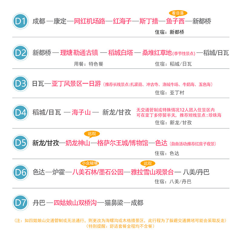 行程从成都(四川省会)直接出发,高铁/航班抵达后即可无缝接驳开启旅程,省去中转耗时。成都作为西南交通枢纽,无论国内国际差旅者均能便捷抵达。返程亦可灵活衔接后续工作安排,真正实现‘说走就走’的高效度假式差旅,让高原之旅成为繁忙工作的完美调剂而非负担。