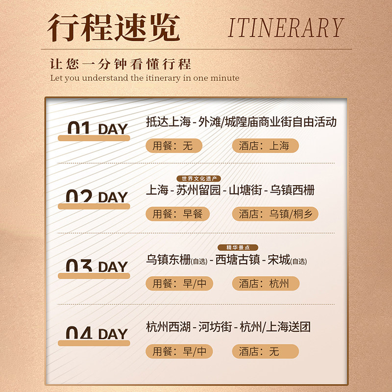 上海、杭州、苏州、嘉兴均位于长三角高铁1-2小时交通圈内,行程充分利用区域交通优势,减少长途车程,提升出行效率。对于以上海为差旅基地的商务人士,此线路几乎无需额外交通成本,即可轻松开启多城联游。高效通达性让4日行程充实而不疲惫,真正实现‘快旅慢游’的理想状态。