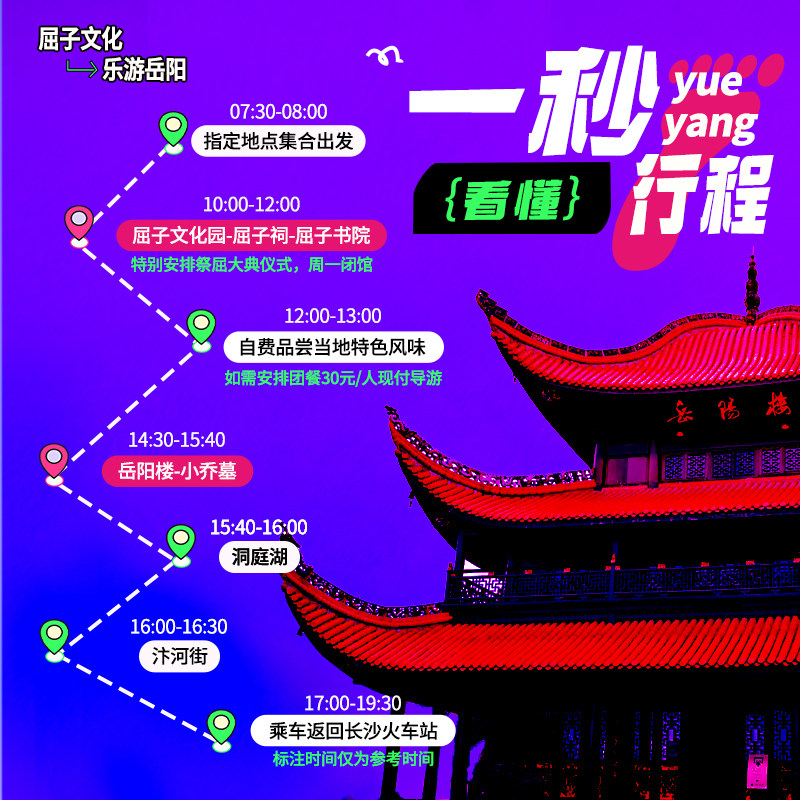 专为商务人士及时间紧凑的差旅人群设计,本线路从长沙出发,当日往返岳阳,全程仅需一日,无需额外住宿安排。早上出发,下午返回,完美嵌入您的差旅日程,既完成工作行程,又可轻松游览岳阳名胜,实现效率与休闲的双重兼顾。