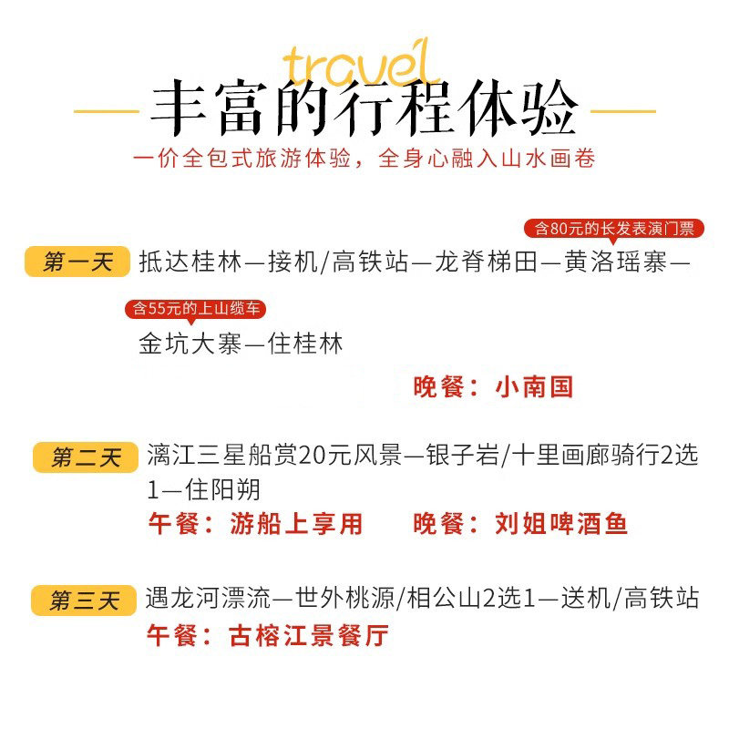 本行程采用“一价全包”模式,涵盖桂林、阳朔、龙脊三大核心景区的交通、住宿、门票及特色体验项目,无需额外支付隐性费用。对于商务差旅或短期度假人群而言,极大简化了行程规划与预算管理,真正实现拎包即走、全程无忧的高效旅行体验。