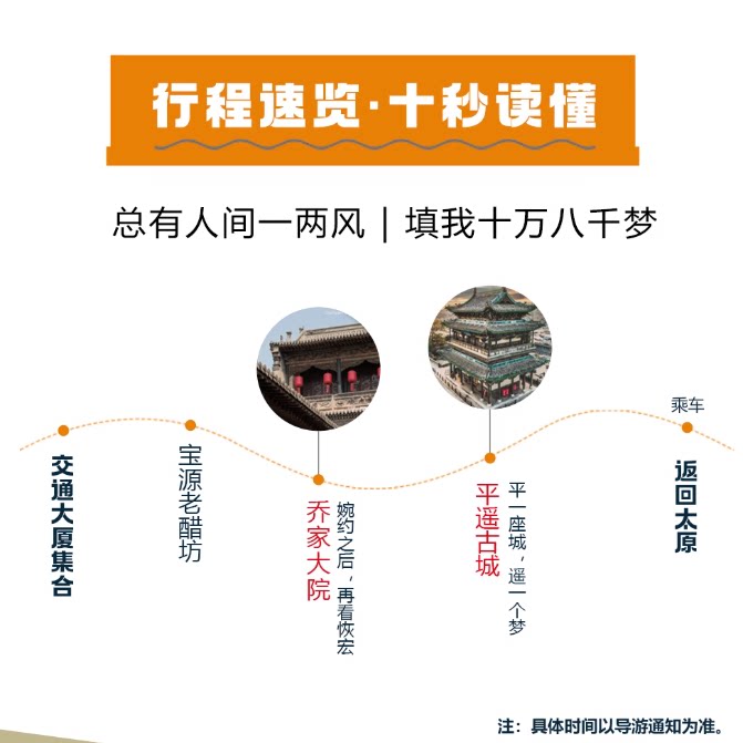 专为商务差旅人士设计的一日游行程,从太原市区便捷出发,全程高速直达晋中平遥古城与乔家大院,节省宝贵时间。行程紧凑但不仓促,上午游览世界文化遗产平遥古城墙、日升昌票号等历史古建,下午探访乔家大院——晋商文化代表建筑群,深度体验山西人文底蕴。全程含门票、交通与专业讲解,无需额外安排,让差旅间隙也能沉浸式感受三晋文化魅力。