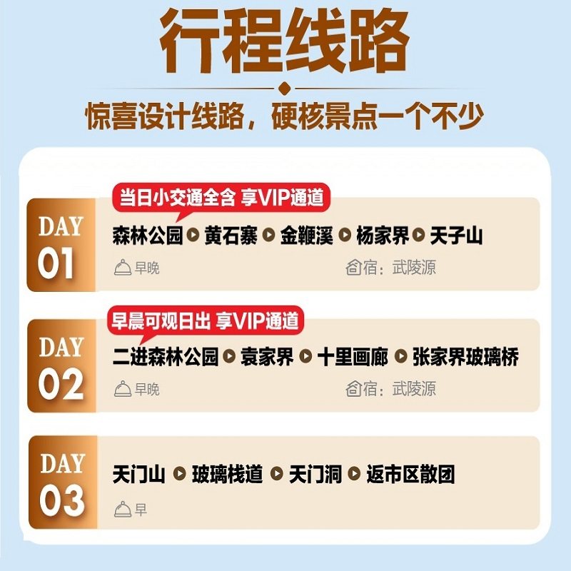 针对差旅人士时间紧凑、效率优先的需求,本行程精心设计为3天2晚纯玩小团,无需拼大团、无购物干扰,可灵活衔接前后会议或出差安排。从抵达张家界起即有专车接站,VIP服务贯穿全程,确保商务人士在有限时间内高效完成工作后,迅速切换至放松度假模式,真正实现‘工作+休闲’的无缝融合。