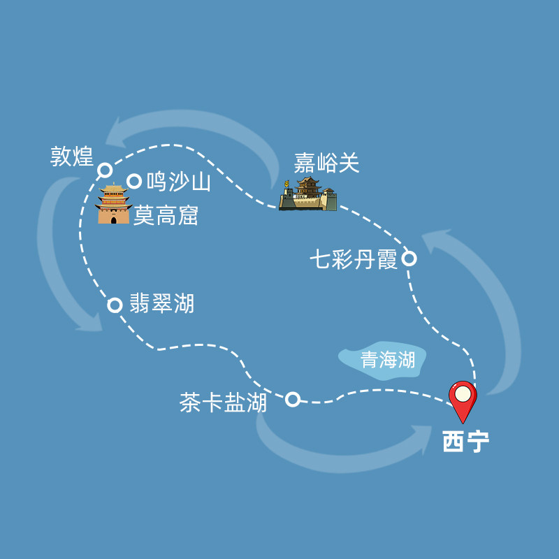 本行程以青海省会西宁为起点,专为差旅人士设计高效衔接的8天7晚青甘大环线。从西宁出发,可便捷衔接全国航班与高铁,节省中转时间;线路覆盖张掖、嘉峪关、酒泉、海西、海北等核心目的地,将七彩丹霞、莫高窟、茶卡盐湖等世界级景观有机串联,兼顾商务出行后的深度放松与文化体验,实现差旅与度假无缝融合。