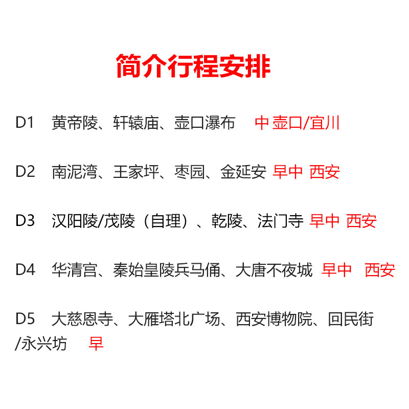 本5天4晚行程以西安为枢纽,科学规划延安、宝鸡等目的地动线,避免重复折返,最大化利用差旅停留时间。涵盖兵马俑、壶口瀑布、法门寺、大唐不夜城等多元主题,满足历史、自然、夜经济等多重体验需求。1人可订、全程专车接送,让差旅出行更高效、更富内涵。