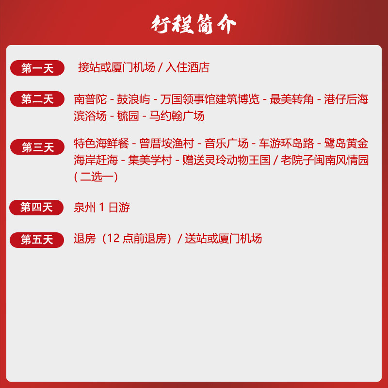 5天4晚的行程设计充分考虑差旅人群的时间敏感性,每日安排张弛有度,既涵盖核心景点又避免过度奔波。上午集中游览、下午预留自由活动或处理工作事务,让您在完成公务的同时,也能沉浸式体验闽南风情,实现工作与度假的完美平衡。